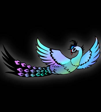 ![]() 天人鳥 三つのスクリーンを小さな影絵の鳥 が舞い、天人がスクリーンから飛び 出してくる直前、大きく映し出される 絵です。優雅さと雄々しさを兼ね備 えています。彩色にはかなりの時間 が費やされました。デザイナー独特 の色彩設計に注目してください! |