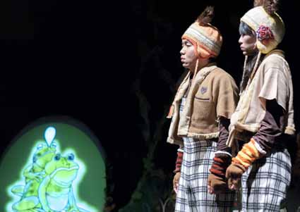 | 白モリアオガエルのおばさんの優しさに触れ、ブンとルキはまだ見ないふるさとを思い出すのです。 |