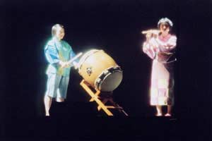 | 打吹山山頂で太鼓を奏でる男の子(鼓太郎)と、笛を奏でる女の子(お春)。 | ![]() |