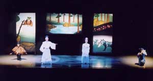 優しい鳥たちの羽を借りて作った仮の衣を授かる天女。 |